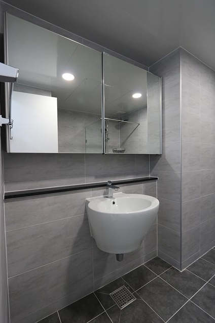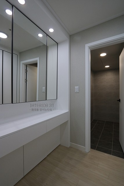 욕실은 큰 특별함 없이 수납공간을 통유리로 채웠고 밑에 작은 세면대를 설치했어요.