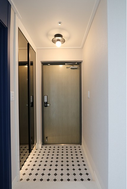 한쪽 신발장은 통유리로 꾸몄으며 바닥을 입체감이 드는 타일로 마감했어요.
