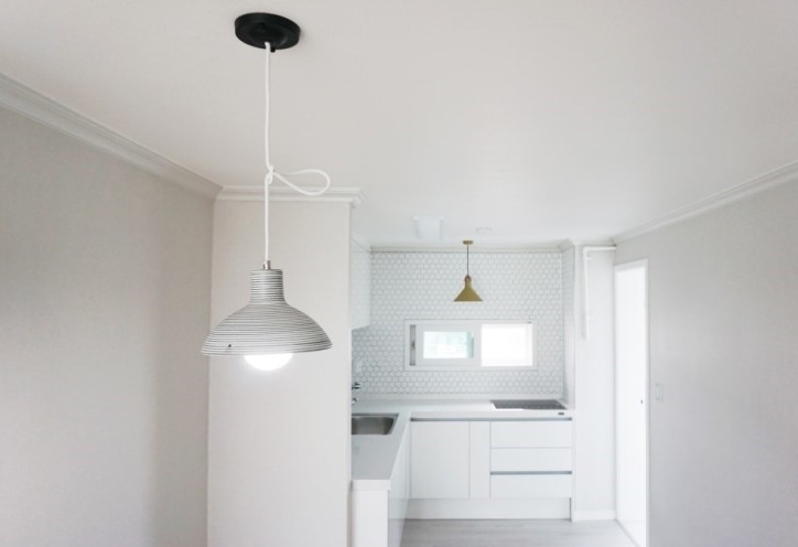 주방에 유일하게 포인트를 준 부분이라면 바로 조명인데요, 금색의 펜던트 조명이 눈에 띕니다.