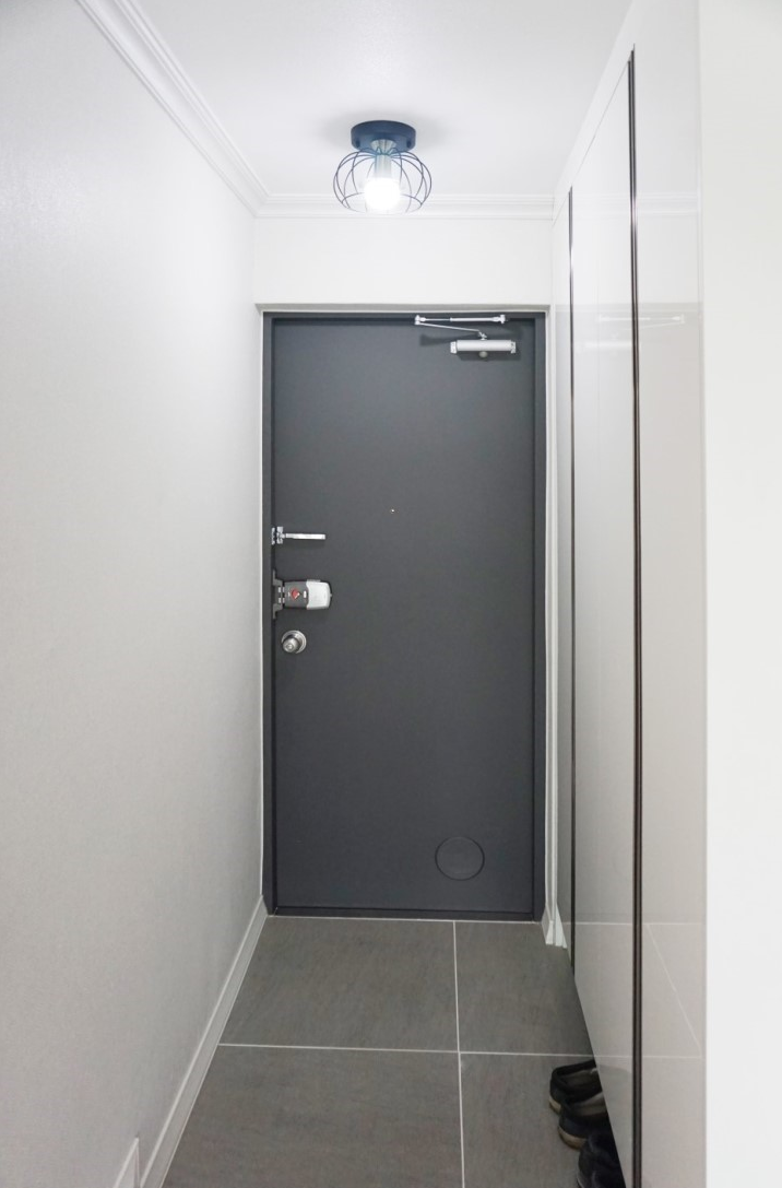 입구 현관은 깔끔하게 큰 타일로 바닥을 시공했고 어두운 회색으로 현관문을 도색했어요.