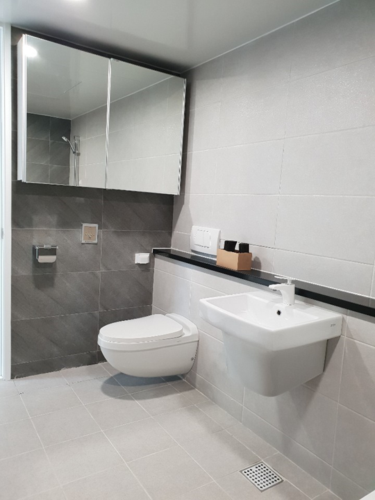 거울로된 수납장은 측면에 배치해주었으며 전체적으로 군더더기 없이 환한 느낌의 욕실로 완성되었답니다.