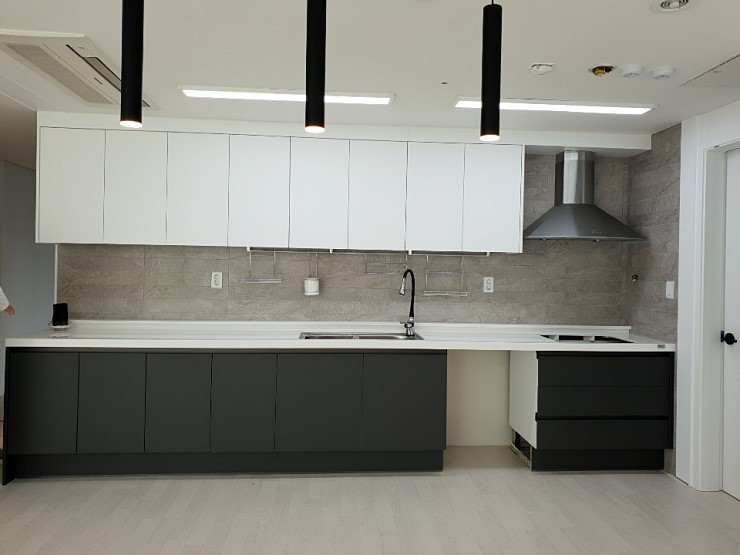 싱크대 하부장은 그레이색으로, 상부장은 화이트색상으로 시공하여