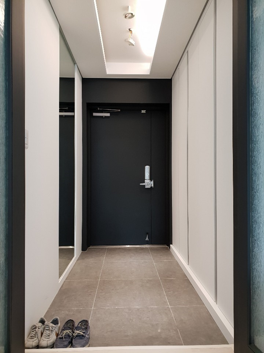 현관문 짙은 그레이톤으로 무게감을 더해 주었답니다.