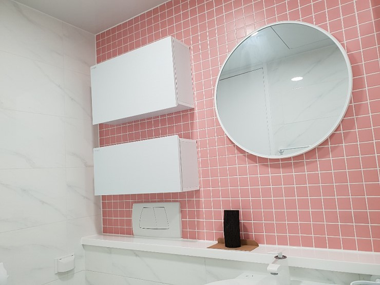 핑크색타일로 욕실이 화사하고 마치 카페욕실같은 사랑스러움이 느껴지는데요