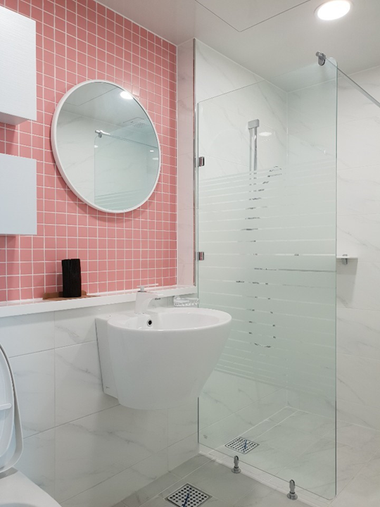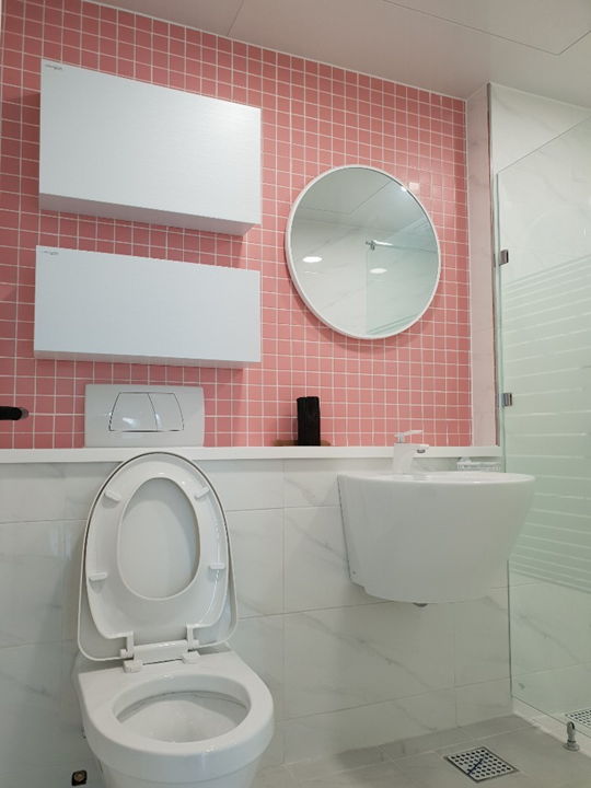 너무 부담스럽지 않게 한쪽 벽면만 핑크색 타일로 포인트를 주어서 부담스럽지 않게 연출되었습니다~