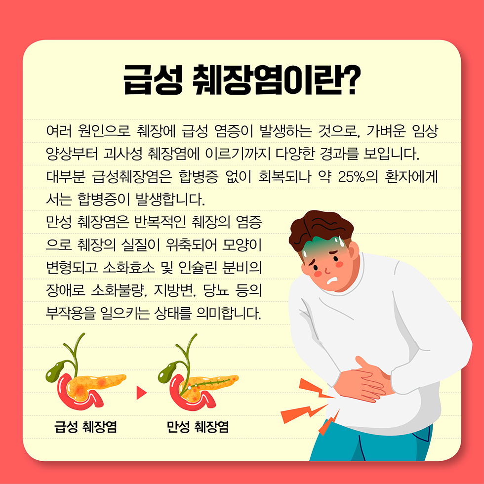 췌장에 문제가 생기면 췌장염이라는 질병에 걸리게 됩니다.