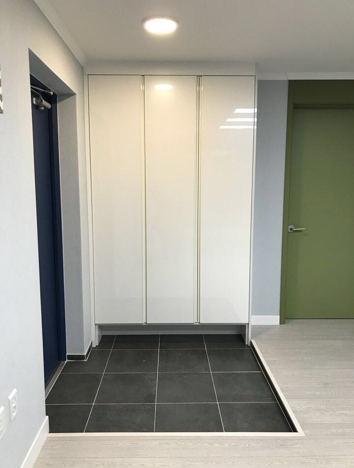 현관문은 블루 색상으로 포인트를 줬고 3단 신발장은 빛이 비치는 자재를 써서 한층 세련된 모습이에요.