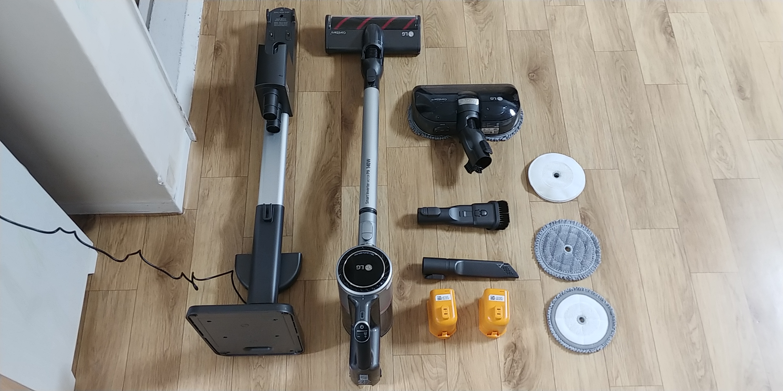 일단 구성품은 본체와 바닥용 회전 브러시, 물걸레용 키트, 추가 흡입구와 충전대, 배터리 2개,
