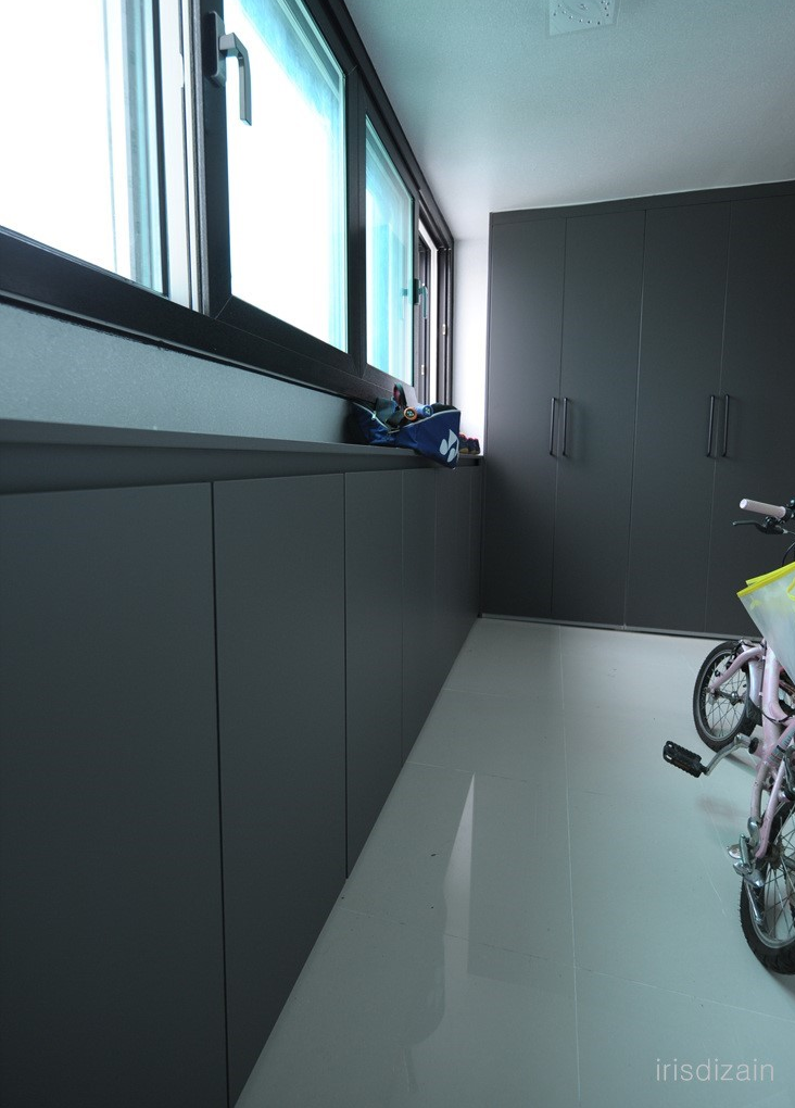 신발장과 통로를 어두운 회색을 써서 차분한 느낌을 연출했어요.