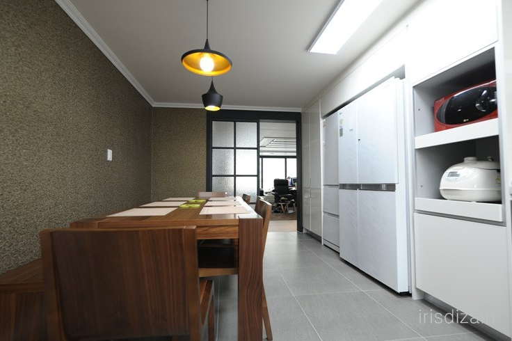 주방은 전체적으로 화이트톤의 밝은 분위기를 내면서 한쪽 벽은 모래 느낌의 벽지를 사용해 투톤 이미지를 완성했어요.