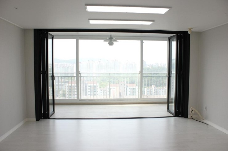 자칫 좁아 보일 수 있는 테라스형 새시지만 거실이 워낙 넓다 보니 오픈한 상태에서 매우 탁 트인 느낌을 받을 수 있어요. 천장에는 대형 LED조명을 일정한 간격으로 시공했고 벽면과 천장, 바닥 모두 화이트색 자재로 마감했습니다.